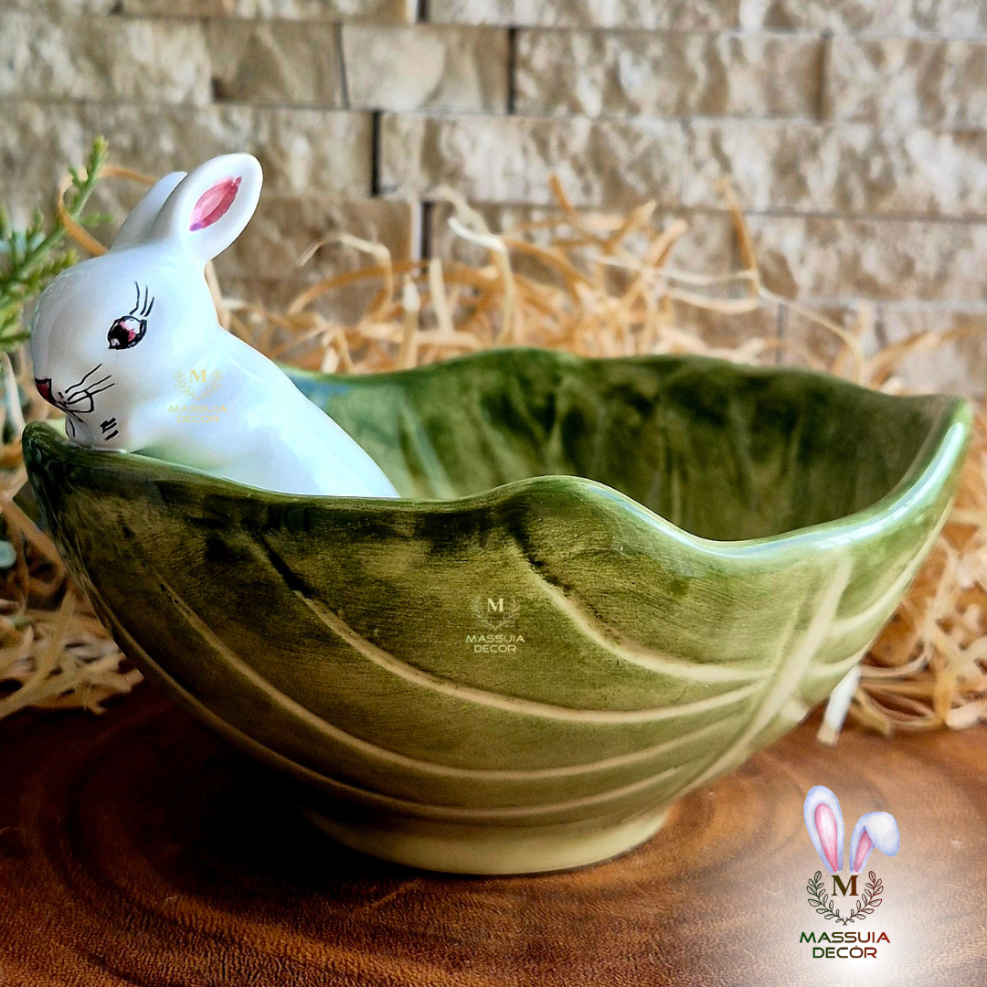 Encante-se com este lindo bowl em formato de repolho, adornado por um charmoso coelhinho em sua borda. Feito de cerâmica de alta qualidade, este item não só irá adicionar charme à sua mesa, mas também é perfeito para servir saladas, frutas e petiscos com estilo.