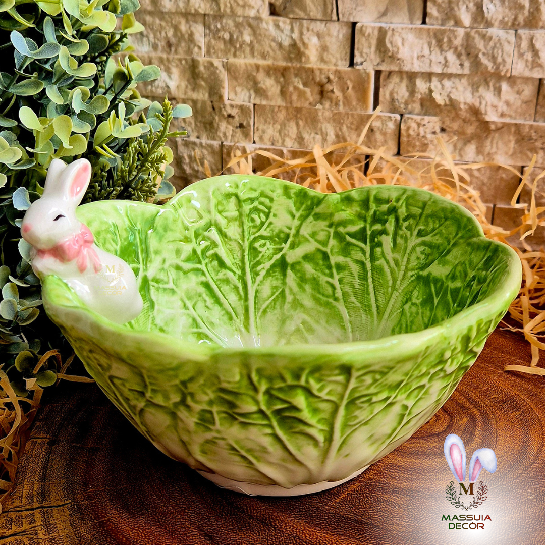 Bowl em formato de repolho com um lindo e curioso coelhinho.