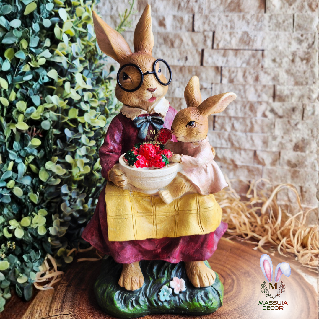 Encante-se com a nossa vovó coelha com sua netinha escolhendo morangos em uma cesta.