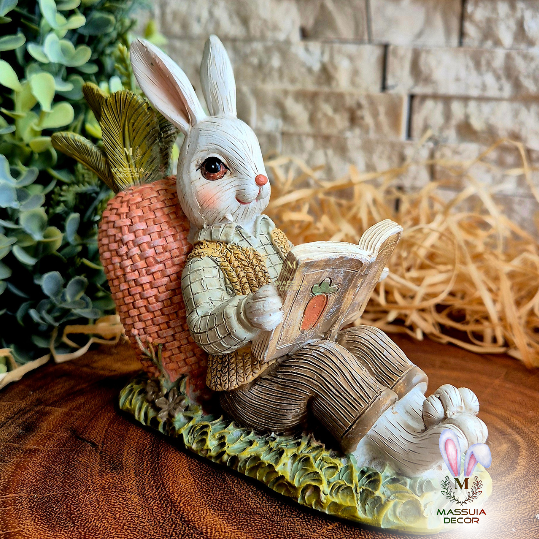 Lindo coelhinho recostado em uma cenoura, lendo o seu livro de histórias da floresta encantada.