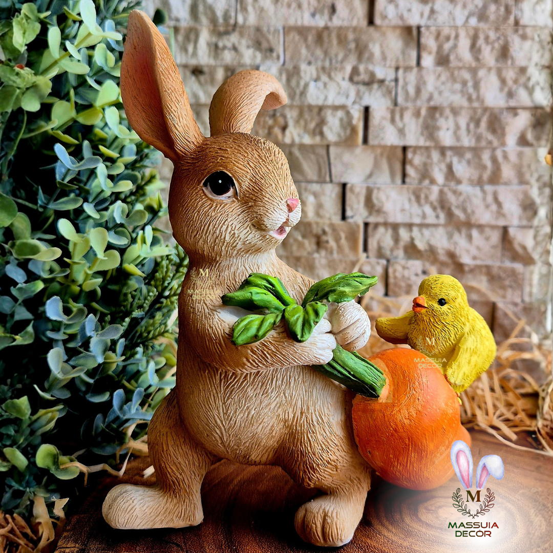 Um charme esse coelhinho pegando uma cenoura e seu amiguino pintinho pegando uma carona.