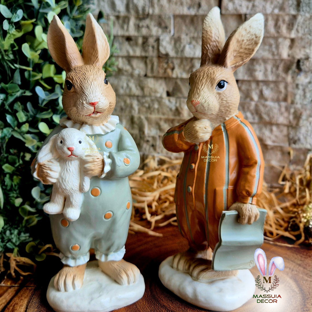 Lindo casal de coelhos com seus charmosos pijamas, prontinhos para tirar um cochilo.