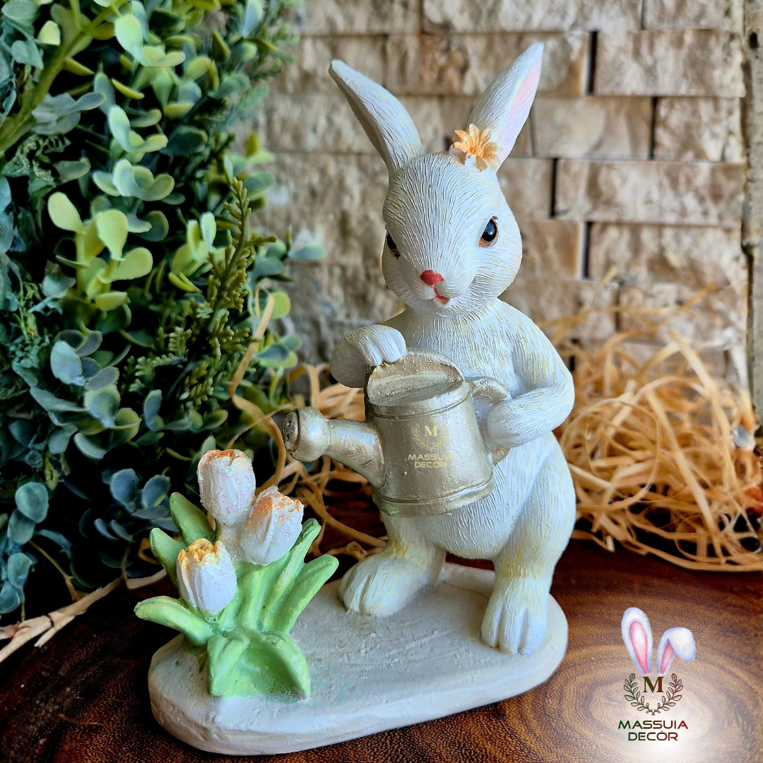 Linda coelha com seu regador cuidando das plantinhas de seu jardim.