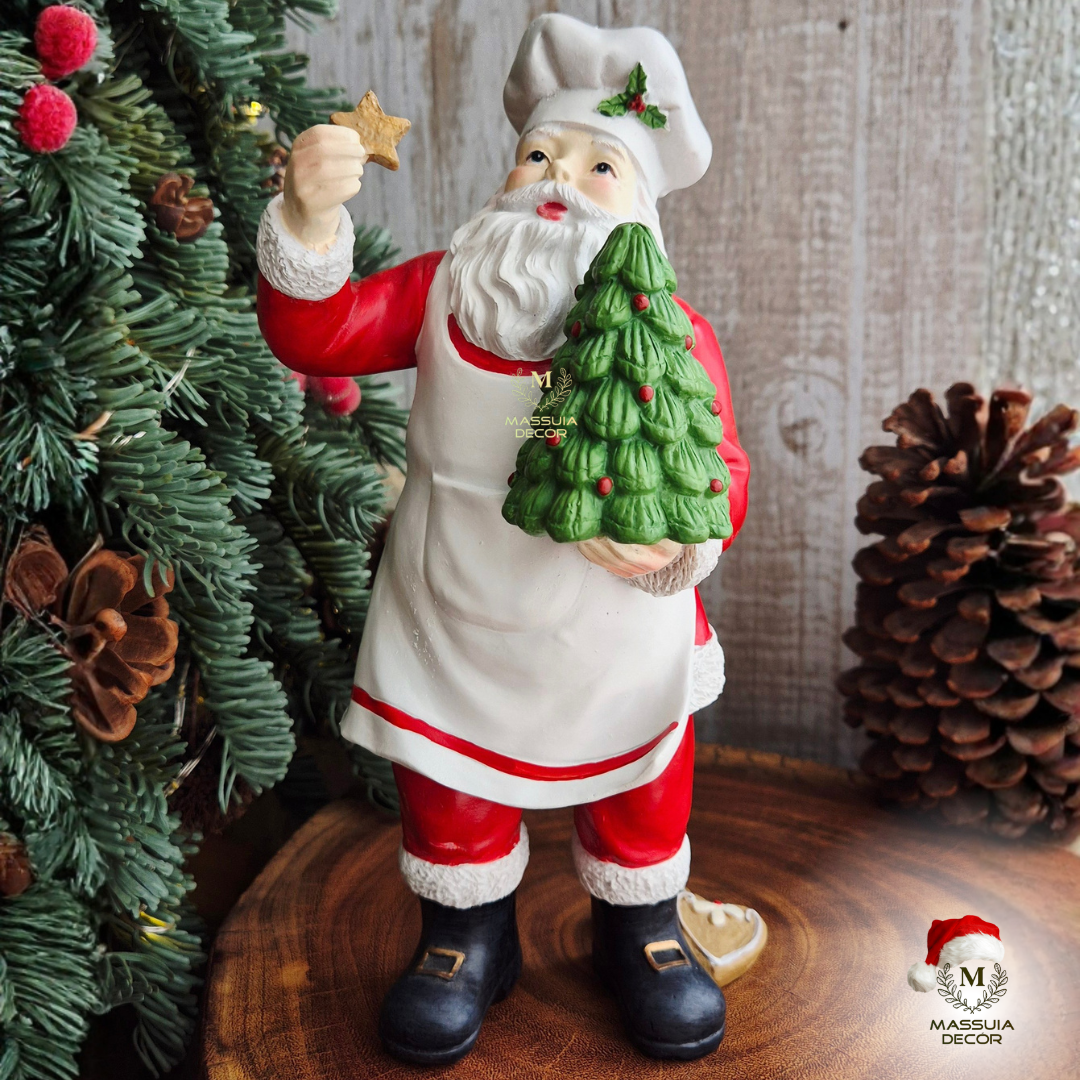 Lindo Papai Noel com sua roupa de confeiteiro com uma Árvore de Natal em uma das mãos e um delicioso biscoito na outra.
