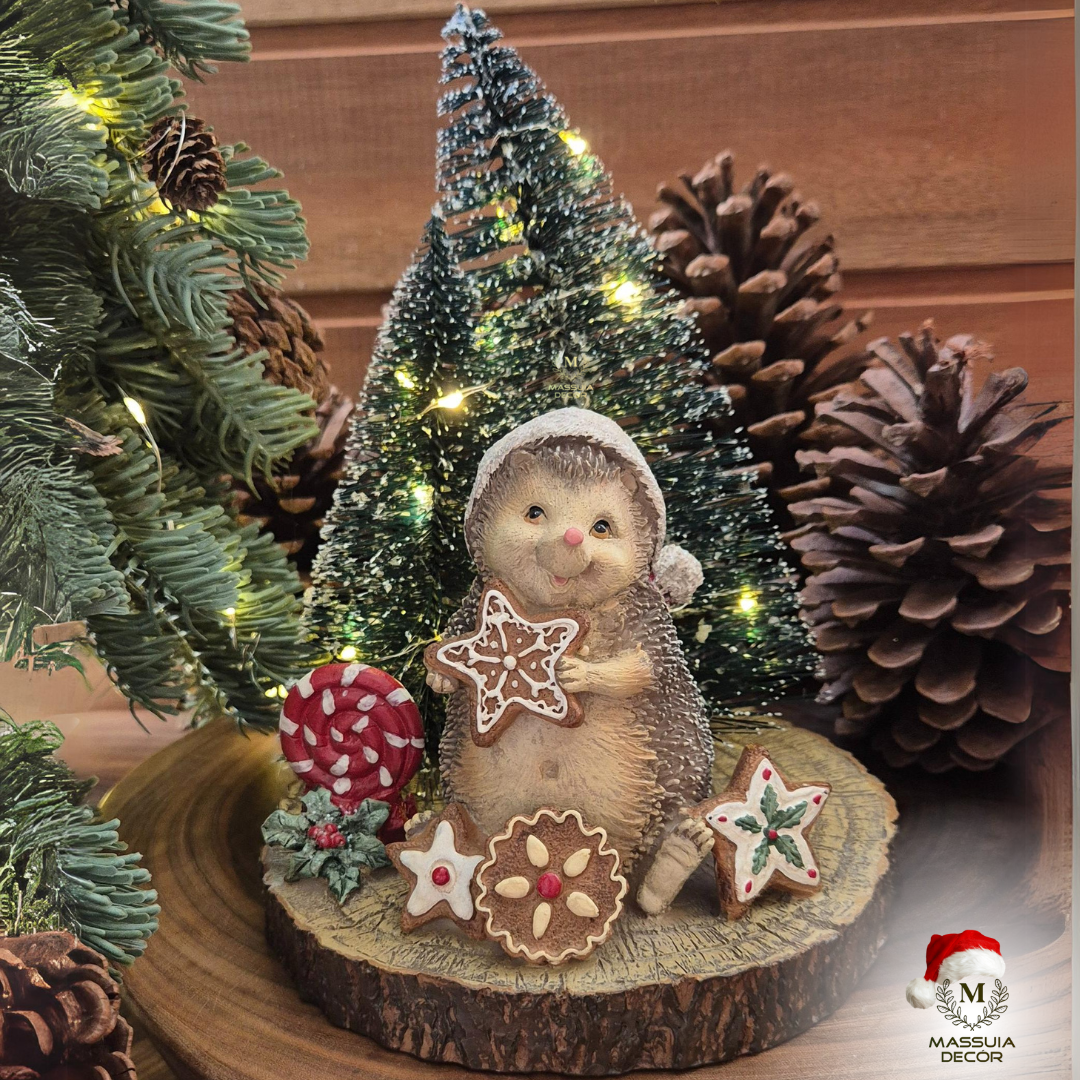 Ouriço Andy com seus biscoitos natalinos! Os pinheiros nevados completam esta linda paisagem com sua iluminação em LED.