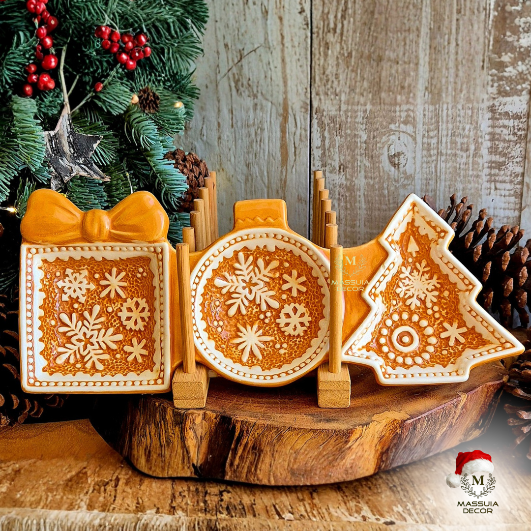 Encante seus convidados com esta petisqueira única, inspirada no tema de Gingerbread. Com design de três partes, sendo uma no formato da Árvore de Natal, outra inspirada em uma Bola de Natal e a última um lindo Presente de Natal. É perfeita para servir diversos petiscos de forma charmosa e organizada. Feita com material resistente e de alta qualidade, esta petisqueira é o complemento ideal para suas celebrações.