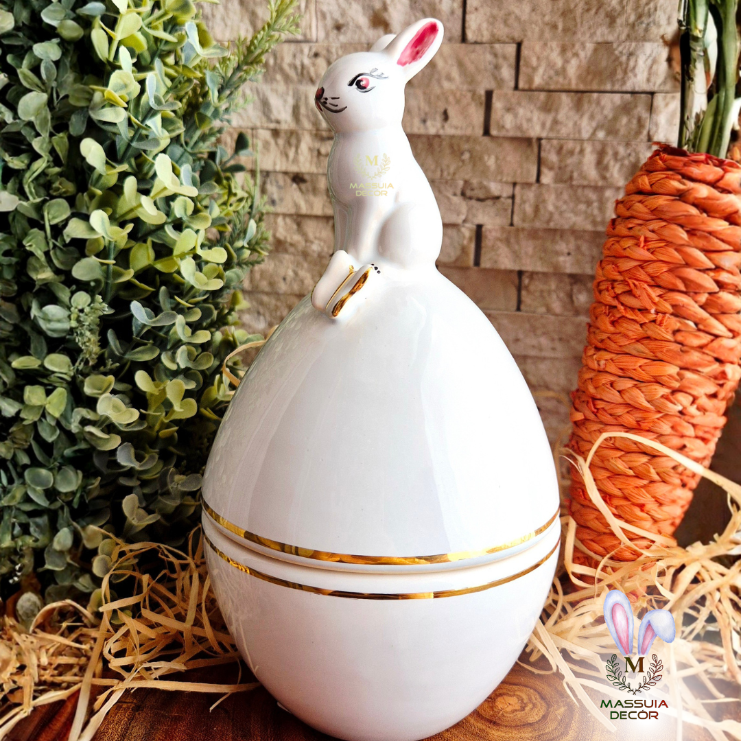 Encante-se com este elegante pote em formato de ovo, adornado com um charmoso coelhinho no topo e acabamento em ouro 18k . Perfeito para adicionar um toque de sofisticação à sua decoração ou presentear alguém especial.