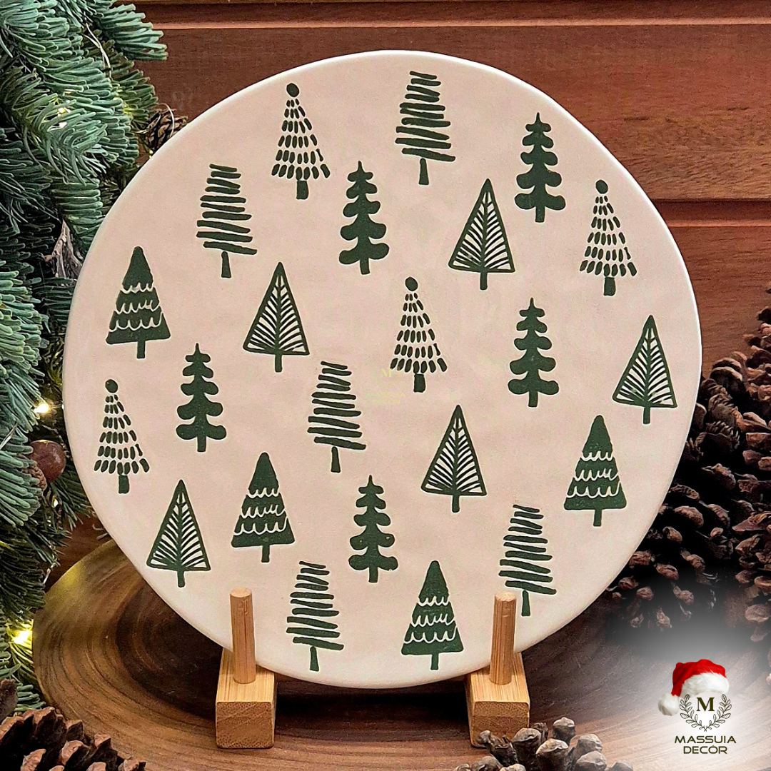 Prato nas cores branco e verde com lindos pinheiros desenhados. Também pode ser utilizado como prato de servir!