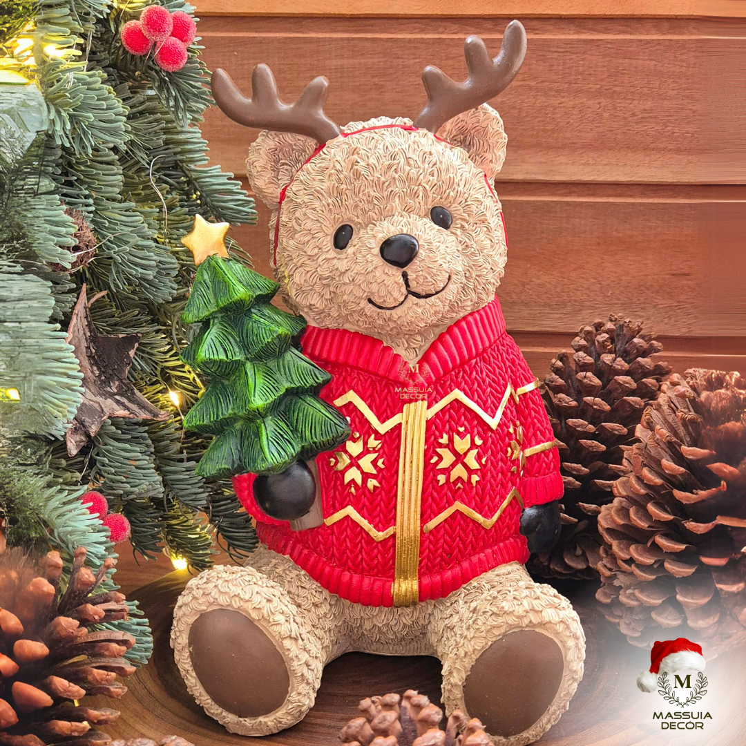 Lindo urso natalino sentado segurando a sua árvore de Natal.